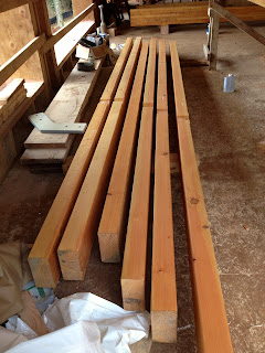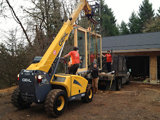 The guys weren't on site for the most part on Friday, but Val showed up on his motorcycle to check on the skylights. This was both fortunate and entertaining. The fortunate part is that Val noticed that we had only received two of our three skylights, so he was able to follow up on the missing skylight right away, and he moved the skylights somewhere far less obvious than the front door. The entertaining part involved our closest neighbor, Deenie, who (with her husband) was the original owner of all the lots on the ridge. One of her sliding glass doors faces our land, and she has enjoyed watching the activity and progress around our new home. On Friday, she called me to tell me that someone on a red motorcycle had parked at the bottom of the driveway and was walking all over the property; she was concerned that this person was "casing the joint" and thought I should come check it out -- but not alone, just to be safe. My current neighbor, Amy, was outside washing her car and agreed to run up to the property with me, so off we went. As we approached the property, we ran across the guy on the red motorcycle -- Val, of course. All was well, Amy got a tour of the house, and I called Deenie later to update her. She told me that after she hung up from our first call she wondered whether it might be one of our builders, but she thought it was worth checking out anyway. "I'm not being nosy," she said, "we just look out for each other around here." I am completely in favor of that! We're happy we have such concerned neighbors and conscientious builders, and we'll be on the lookout for ways to return the favors.
