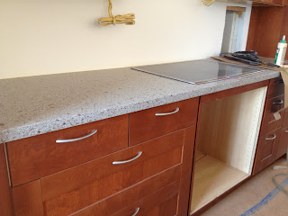 The plumber spent a few days here installing all our sinks, faucets and shower heads (he was leaving just as I arrived today), so the bathrooms are looking much more complete -- as is the kitchen, with its new sink, faucet and hot/cold water dispenser, plus an "air switch" button for the garbage disposal. He'll be back once the water is up and running in the house. Today the remainder of our counter -- the bar -- arrived after a snafu that required a bar do-over. Looks like we're almost ready to start cooking!